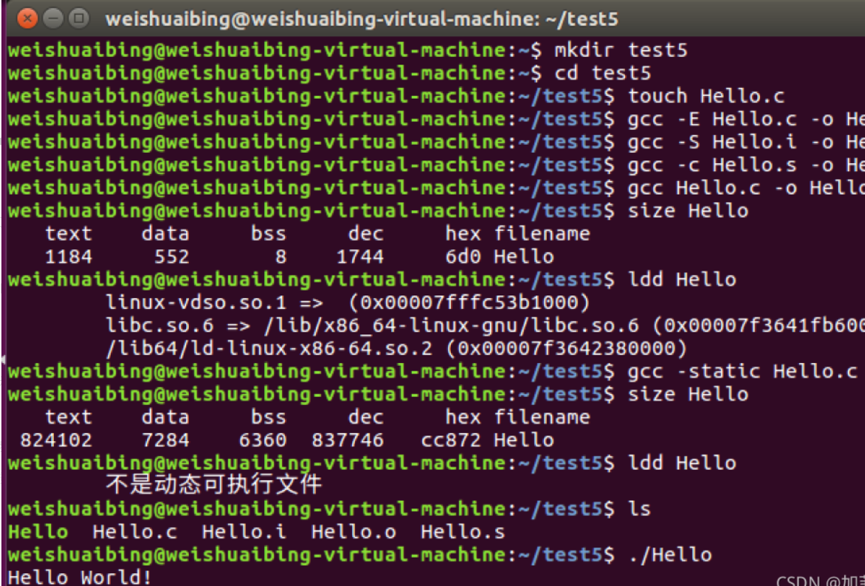 无论静态库,还是动态库,都是由.o 文件创建的。因此,我们必须将源程序 hello.c 通过 g