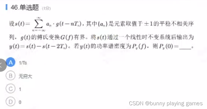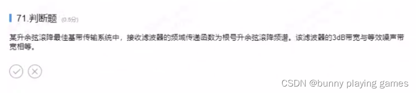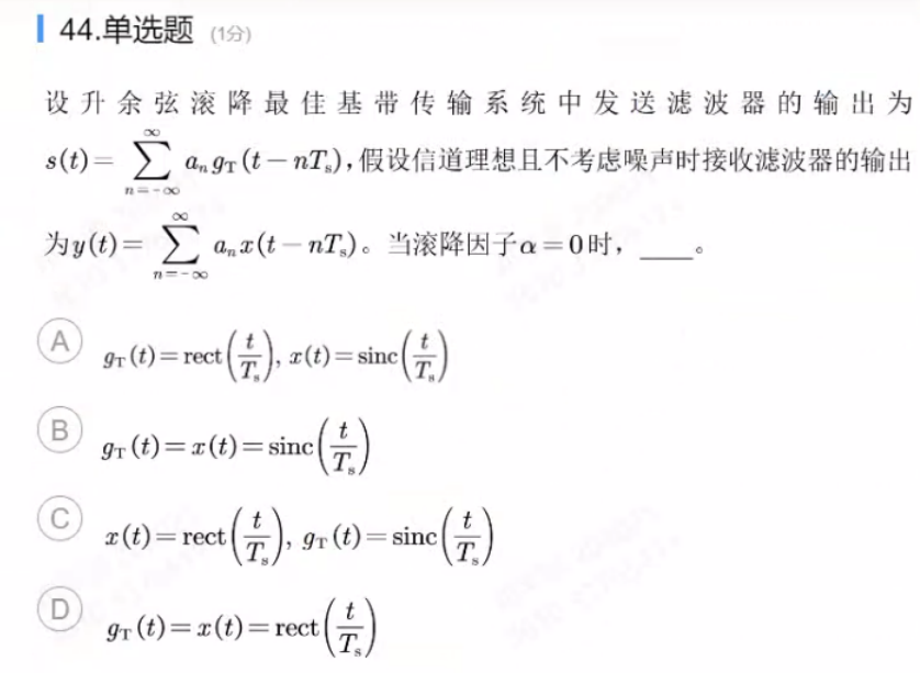 44. 设升余弦滚降最佳基带传输系统中发送滤波器的输出为s()- agr(t- nT),假设信道理想且不考虑噪声时接收波器的输出为y()-a.z(t-nT)。当滚降因子a=0时,