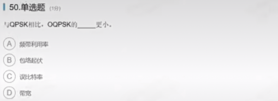 50. 与QPSK相比。OQPSK的__更小——频带利用率 包络起伏 误比特率 带宽