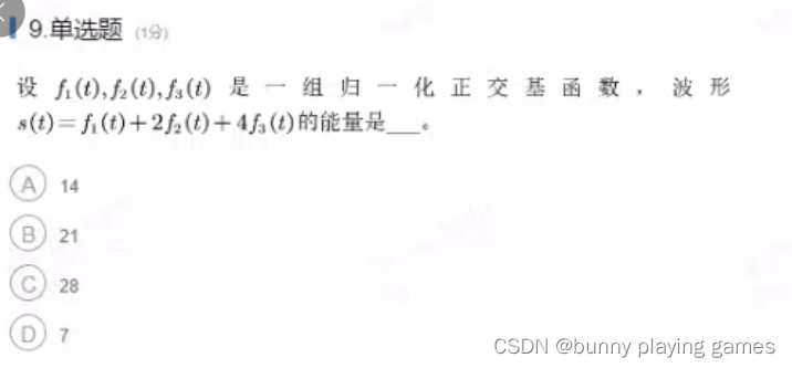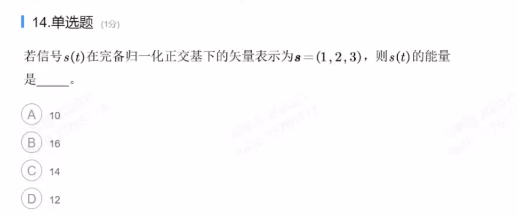 14. 若信号s(t)在完备归一化正交基下的矢量表示为s =(1,2,3),则s(t)的能量是
