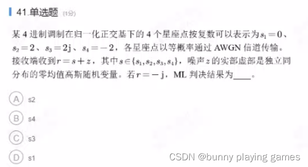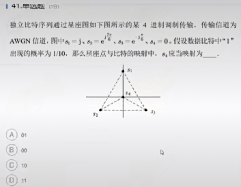 41. 独立比特序列通过星座图如下图所示的某 4 进制调制传输,传输信道为AWGN信道,图中s=j、s=e号、sa=e%、8=0。假设数据比特中“1"出现的概率为 /10。那么星座点与比特的映射中,s4.应当映射为