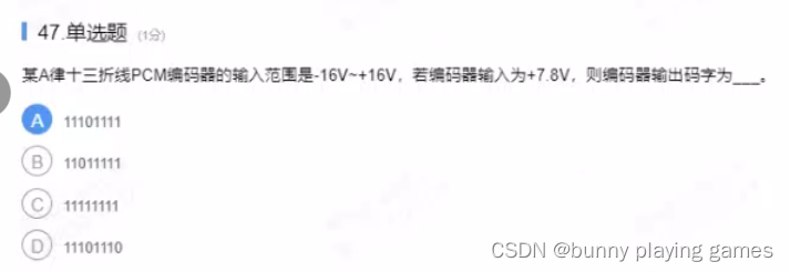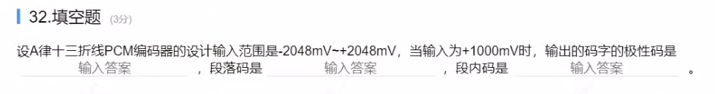 32. 设A律十三折线PCM编码醒的设计输入范围是-2048mV-+2048mV,当输入为+1000mV时,输出的码字的极性码是,段落码是,段内码是