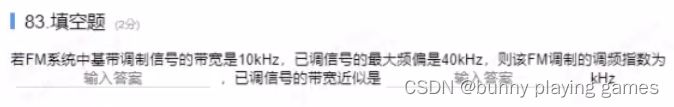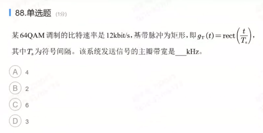 88. 某64QAM调制的比特速率是 12kbit/s,基带脉冲为矩形,即gr(t)= rect(其中T为符号间隔。该系统发送信号的主瓣带宽是 kHz。