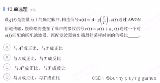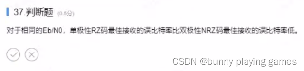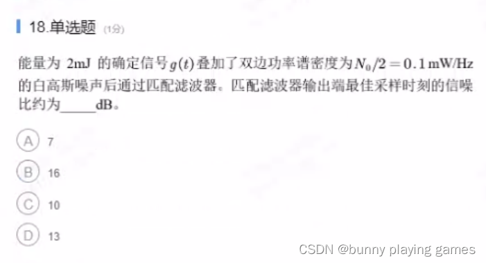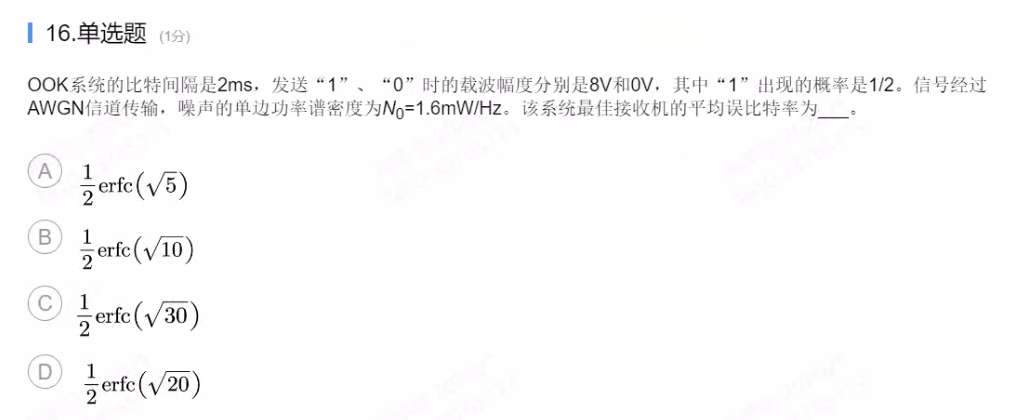 16. OOK系统的比特间隔是2ms,发送“1”、“0”时的载波幅度分别是8V和OV,其中“1”出现的极半是1/2。信号经过AWGN信道传输,噪声的单边功率谱密度为No=1.6mW/Hz,该系统最佳接收机的平均误比特率为_
