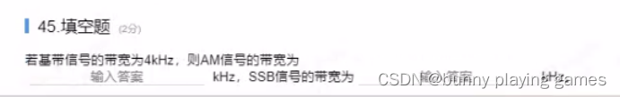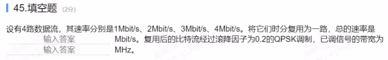 45. 设有4路数据流,其速率分别是1Mbit/s、2Mbit/s、3Mbit/s、4Mbit/s。将它们时分复用为一路,总的速率是 Mbit/s。复用后的比特流经过滚降因子为0.2的QPSK调制,已调信号的带宽为 MHz。