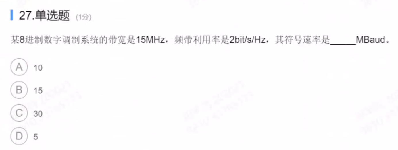 27. 某8进制数字调制系统的带宽是15MHz,频带利用率是2bit/s/Hz,其符号速率是MBaud。