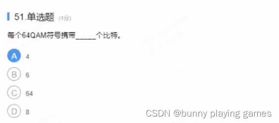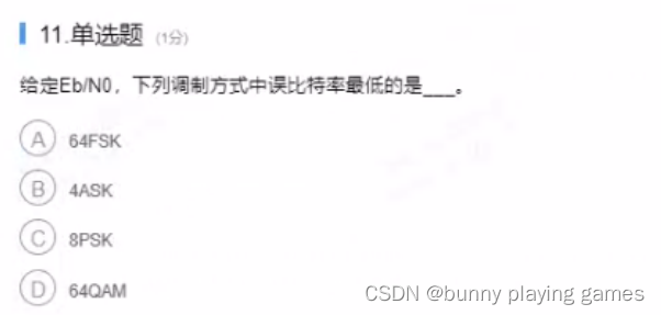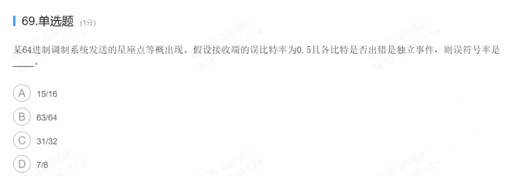 69. 某64进制调制系统发送的星座点等概出现。假设接收端的误比特率为0.5且各比特是否出错是独立事件,则误符号率是