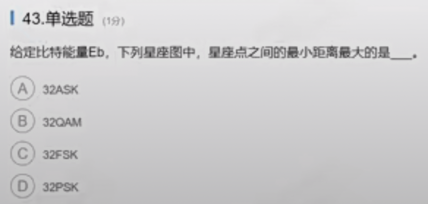 43. 给定比特能量Eb。下列星座图中,星座点之间的最小距离最大的是