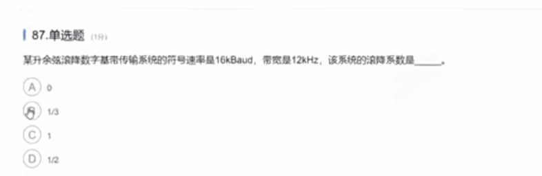 87. 某升余弦滚降数字基带传输系统的符号速率是16kBaud,带宽是12KHz,该系统的滚降系数是