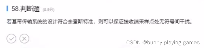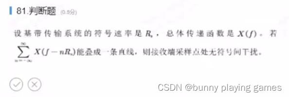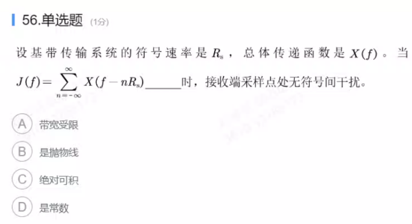 56. 设基带传输系统的符号速率是 R,总体传递函数是X()。当J()-x(f-nR_时,接收端采样点处无符号间干扰。