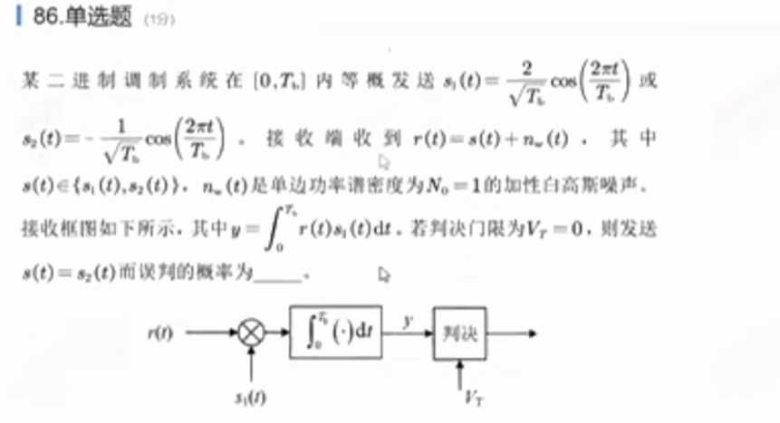86. 某二进制调制系统在 [0,T] 内等发送。接收端收到 r()=s()+n(),其中,n()是单边功率谓密度为N。1的加性白高斯噪声。接收框图如下所示。其中y=~r()s;(t)dt。若判决门限为V0,则发送8(t)= s(t)而误判的概率为