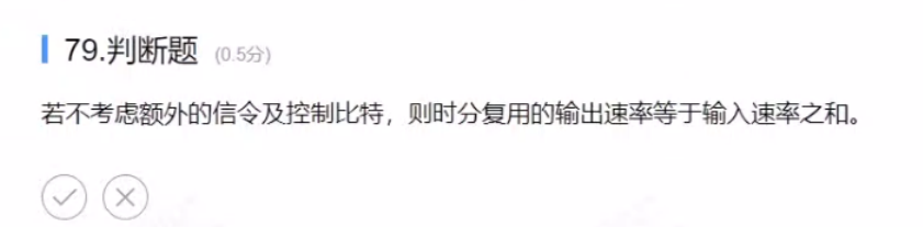 79. 若不考虑额外的信令及控制比特,则时分复用的输出速率等于输入速率之和。