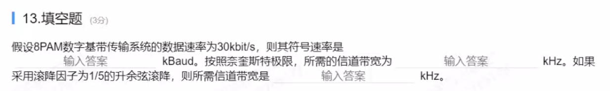 13. 假设8PAM数字基带传输系统的数据速率为 30kbit/s,则其符号速率是 kBaud。按照亲率斯特极限,所需的信道带宽为kHz。采用滚降因子为1/5的升余弦滚降,则所需信道带宽是
