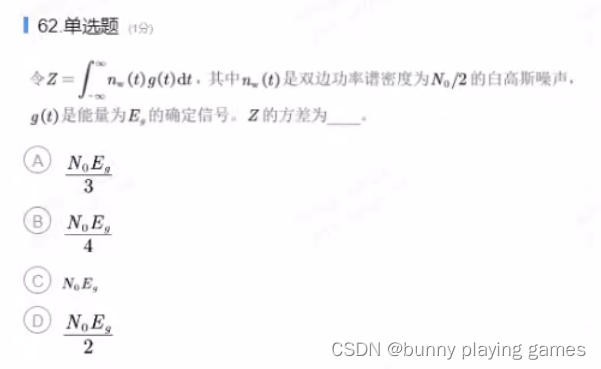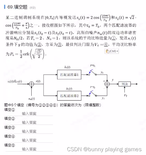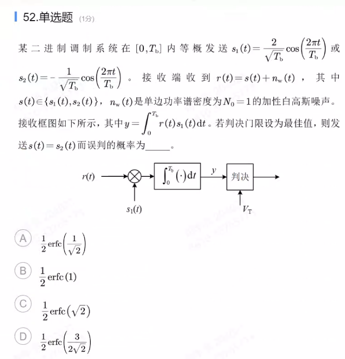 52. 某二进制调制系统在 [0,Zu]内等概发送 ,()o或。接收端收到 r()=s()+n() ,其中,n(t)是单边功率密度为N1的加性白高斯噪声。接收框图如下所示,其中y= “r(t)s;(t)dt。若判决门限设为最佳值,则发送s(t)= s2(t)而误判的概率为_