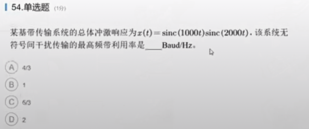 54. 某基带传输系统的总体冲激响应为z(t)= sinc(1000t)sinc(20001)。该系统无符号间干扰传输的最高频带利用辜是Baud/Hz。