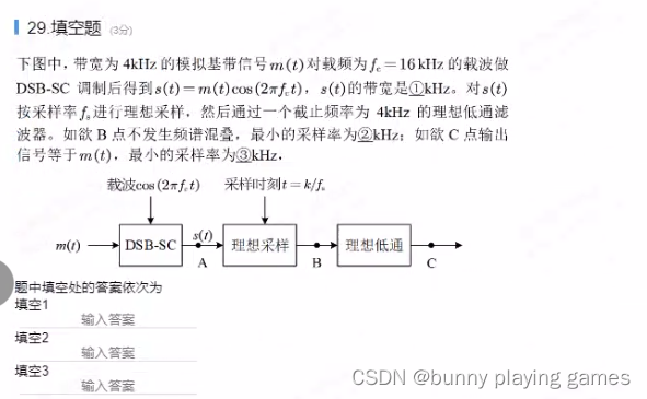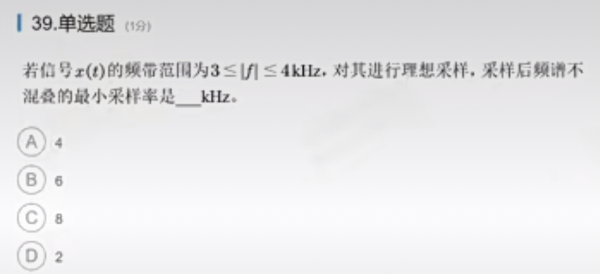 39. 若信号(8)的频带范围为3≤A4kIIz对其进行理想采样,采样后频谱不混叠的最小采样率是 kHz