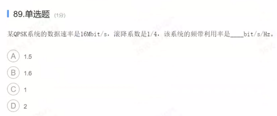 89. 某QPSK系统的数据速率是16Mbit/s,滚降系数是1/4,该系统的频带利用率是 _bit/s/Hz。