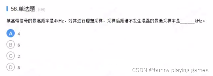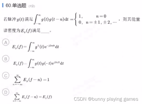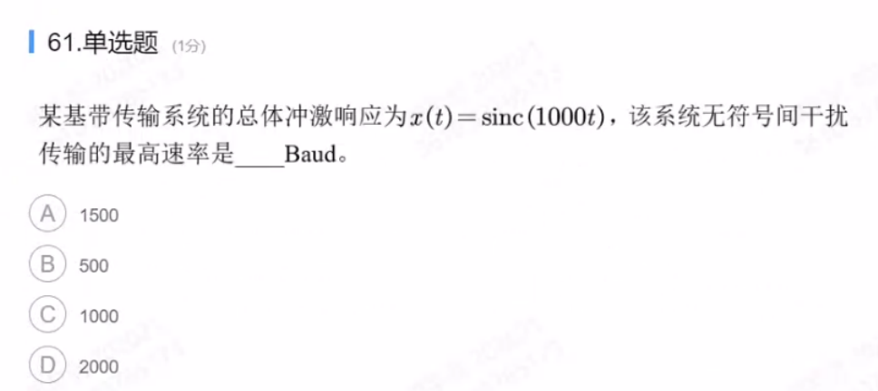 61. 某基带传输系统的总体冲激响应为z(t)= sinc(1000t),该系统无符号间干扰传输的最高速率是Baud