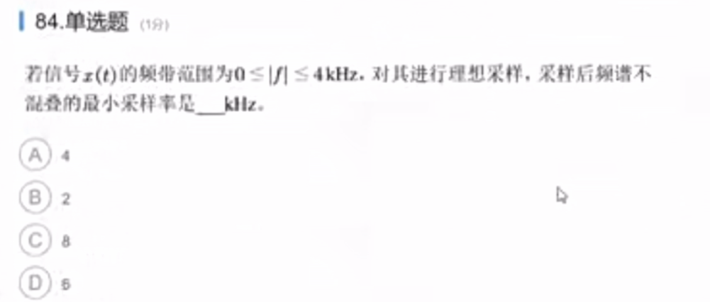 84. 若信号=(0)的频带范围为 对其进行理想采样,采样后频谱不混叠的最小采样率是kllz。