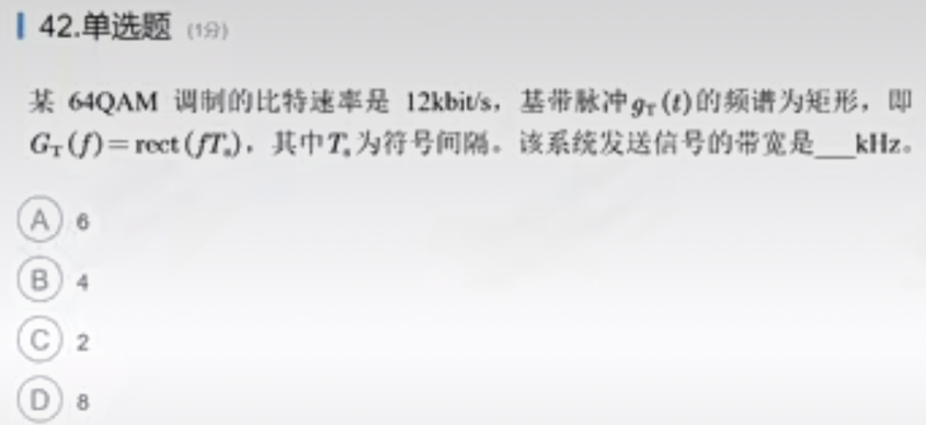 42. 某 64QAM 调制的比特速率是 12kbit/s,基带脉冲gr()的频谱为矩形,即G()= rcct(fT),其中T为符号间。该系统发送信号的带宽是 kllz