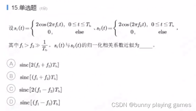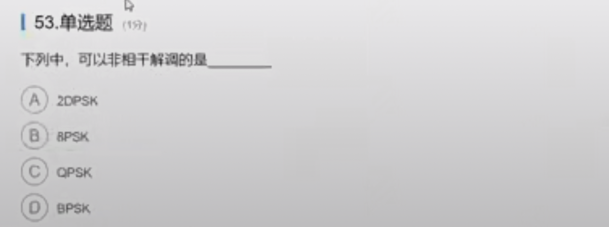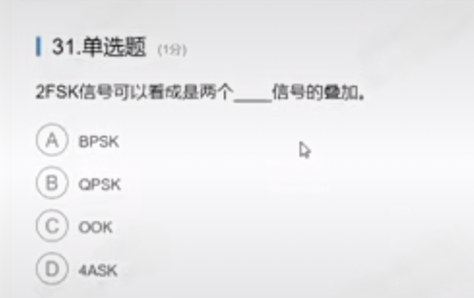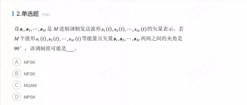 2. 设s1,s2,…,sm是M进制调制发送波形s,(t),s2(t),sm(t)的矢量表示。若M 个波形s1(t),s2(t),..,sm(t)等能量且量s1,s2,…,sm两两之间的夹角是90°,该调制很可能是
