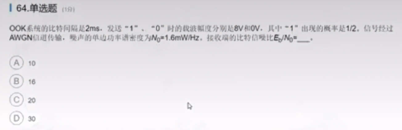 64. OOK系统的比特间隔是2ms,发送“1” -0”时的载波幅度分期是8V和OV。其中“1”出现的概率是1/2。信号经过AWGN信道传输,噪声的单边功率谱密度为No=1.6mW/Hz。按收端的比特信噪比ENo=__
