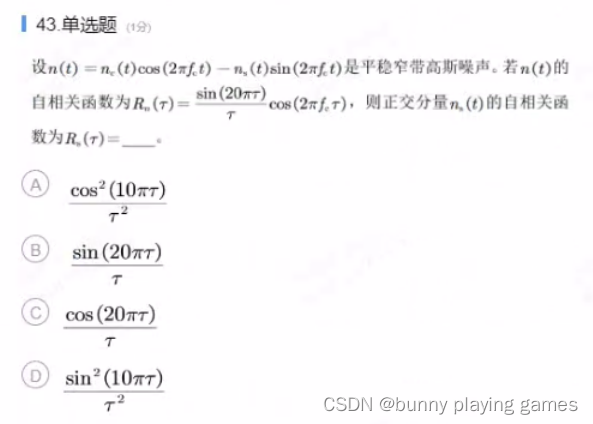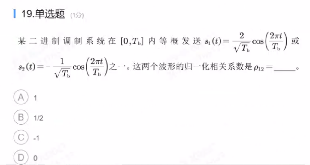 19. 某二进制调制系统在 [0,Z]内等概发送 ,()co或s()=-co之一这两个波形的归一化相关系数是pi