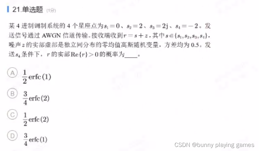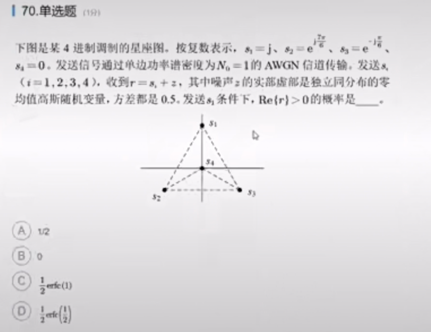 70. 下图是某 4 进制调制的星座图。按复数表示,。发送信号通过单边功率谱密度为N=1的AWGN 道传输。发送&(i=1,2,3,4),收到r=.+,其中噪声z 的实部能是独立同分布的零均值高斯随机变量,方差都是 0.5.发送s条件下,Refr>0的概率是