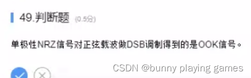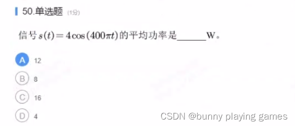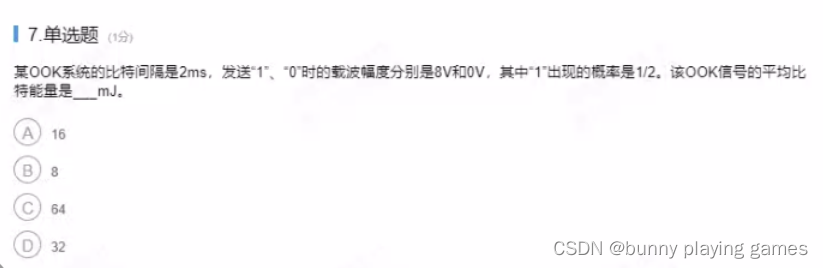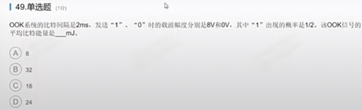 49. OOK系统的比特间隔是2ms,发送“1”、“0”时的载波幅度分别是8V和OV,其中“1”出现的概率是1/2,该0OK信号的平均比特能量是_ mJ.