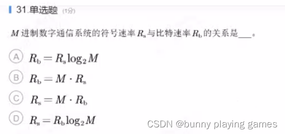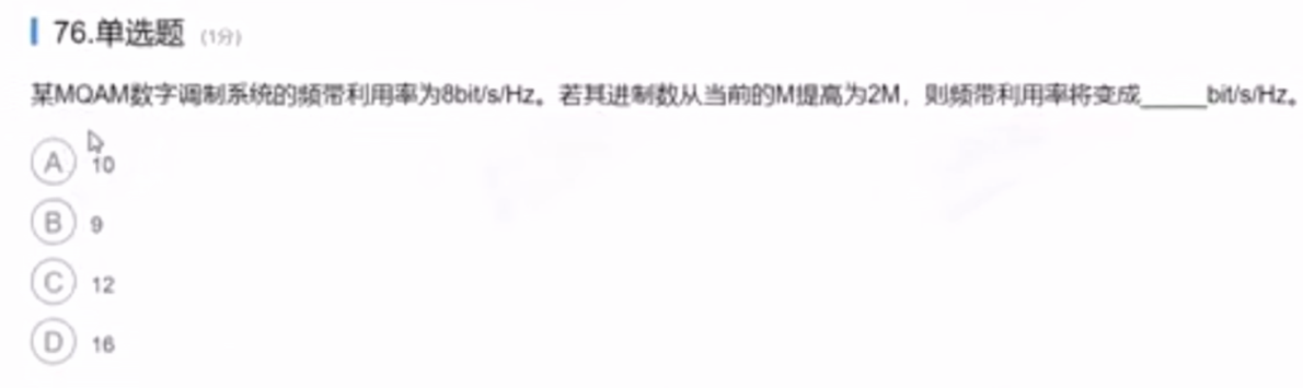 76. 某MQAM数字通制系统的频带利用率为8biVs/HZ。若其进制数从当前的9M提高为2M,则频带利用率将变成bVs/Hz