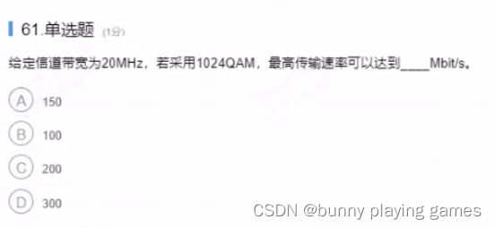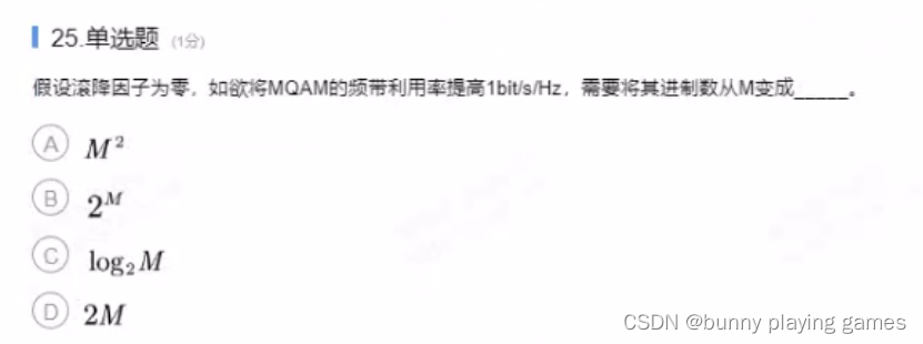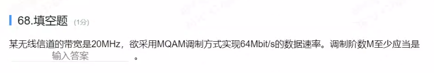 68. 某无线信道的带宽是20MHz,欲采用MQAM调制方式实现64Mbit/s的数据速率。调制阶数M至少应当是