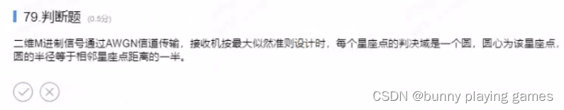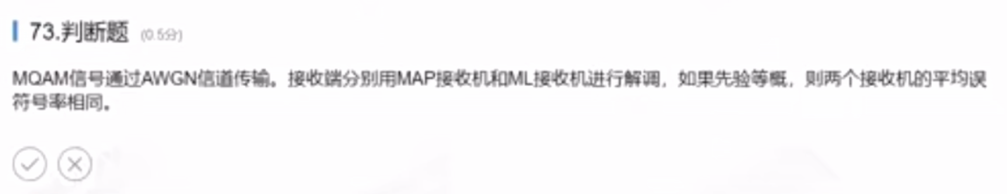 73. MQAM信号通过AWGN信道传输。接收端分别用MAP接收机和ML接收机进行解调,如果先验等概,则两个接收机的平均误符号率相同。