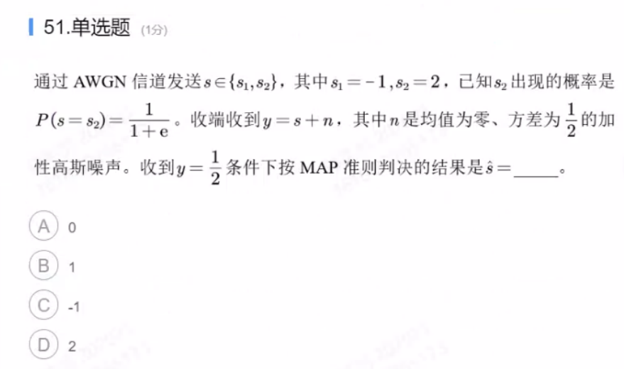 51. 通过AWGN 信道发送se{,82),其中S=-1,82=2,已知出现的概率是P(s=s)=1。。收端收到y=s+n,其中n是均值为零、方差为 的加性高斯噪声。收到y=条件下按 MAP 准则判决的结果是s=