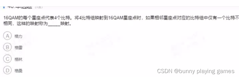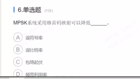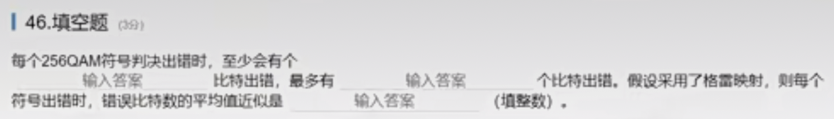 46. 每个256QAM符号判决出谓时,至少会有个 比特出错,最多有个比特出错。假设采用了格雷映射,则每个符号出错时,错误比特数的平均值近似是 (整数)。