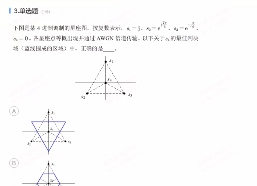 3. 下图是某 4 进制调制的星座图。按复数表示,……。各星座点等概出现并通过 AWGN 信道传输。以下关于s,的最佳判决域(蓝线围成的区域)中,正确的是