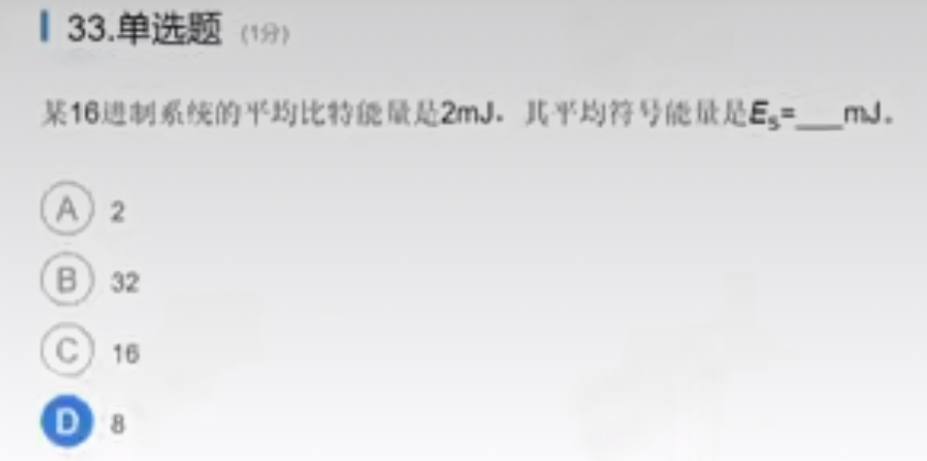 33. 某16进制系统的平均比特能量是2mJ,其平均符号能量是Es=_mJ.