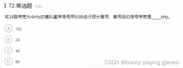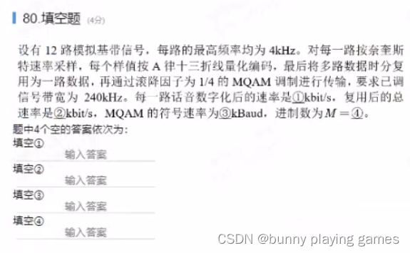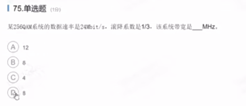 75. 某256QA系统的数据速率是24Moit/s。滚降系数是1/3,该系统带宽是_MHz