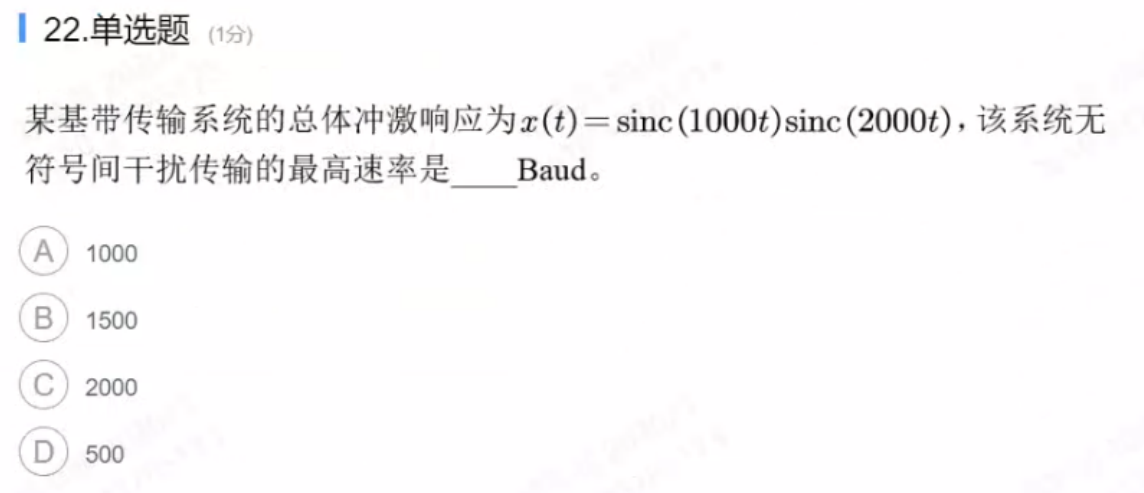 22. 某基带传输系统的总体冲激响应为z(t)= sinc(1000t)sinc(2000t),该系统无符号间干扰传输的最高速率是Baud