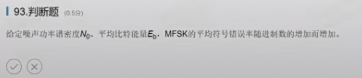 93. 给定噪声功率谱密度No、平均比特能量E,MFSK的平均符号错误半随进制数的增加而增加。