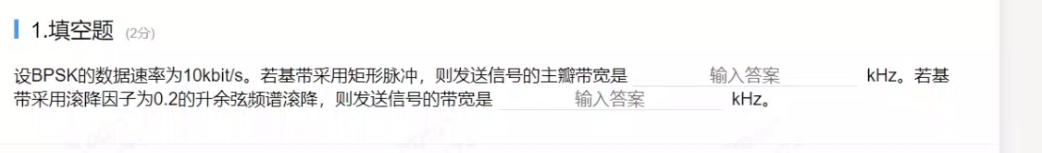 1.设BPSK的数据速率为10kbit/s。若基带采用矩形脉冲,则发送信号的主瓣带宽是kHz,若基带采用滚降因子为0.2的升余弦频谱滚降,则发送信号的带宽是kHz。