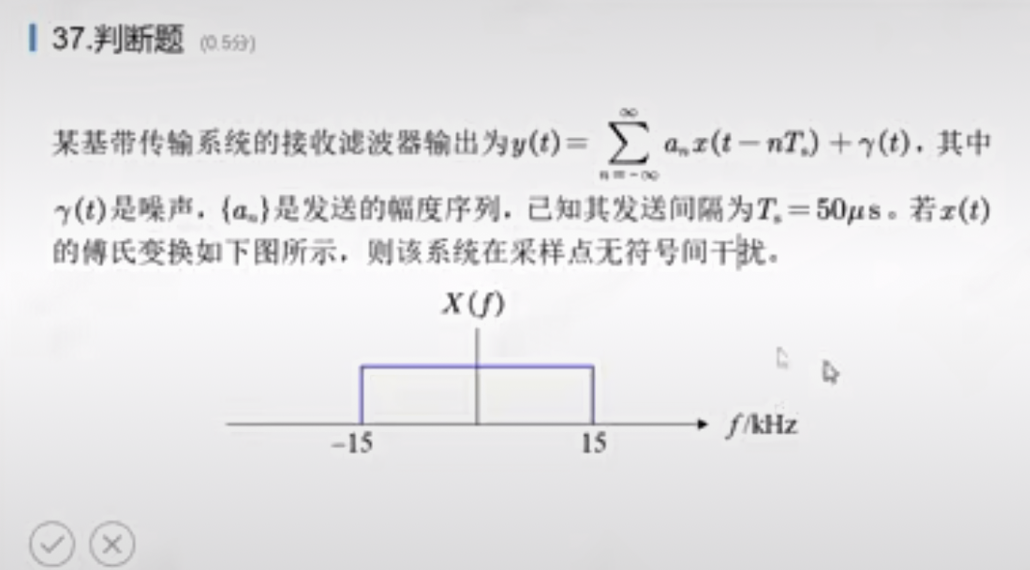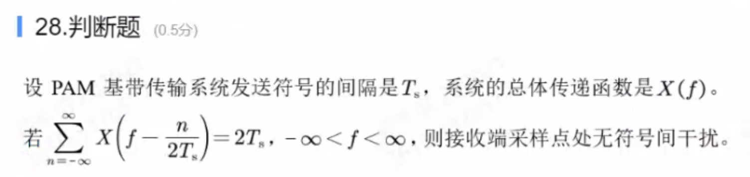 28. 设 PAM 基带传输系统发送符号的间隔是T,系统的总体传递函数是X()。若,则接收端采样点处无符号间干扰。