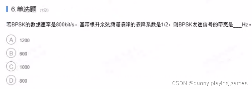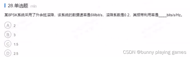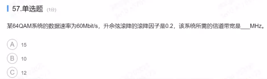 57. 某64QAM系统的数据速率为60Mbit/s,升余弦滚降的滚降因子是0.2,该系统所需的信道带宽是 MHZ