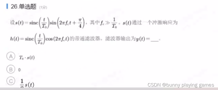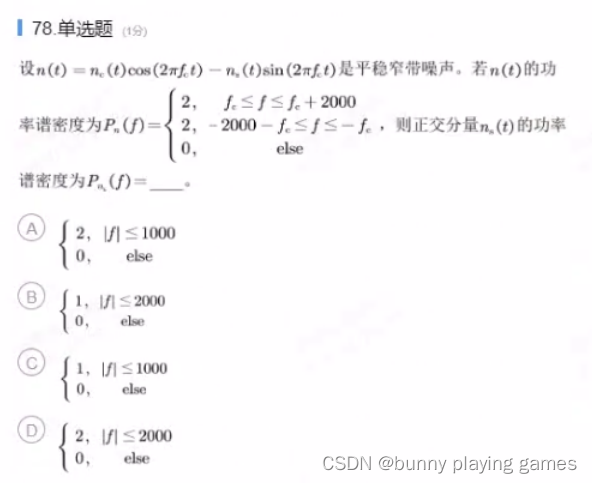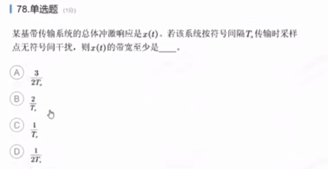78. 某基带传输系统的总体冲激响应是x(t)。若该系统按符号间隔T传输时采样点无符号间干扰,则z(t)的带宽至少是