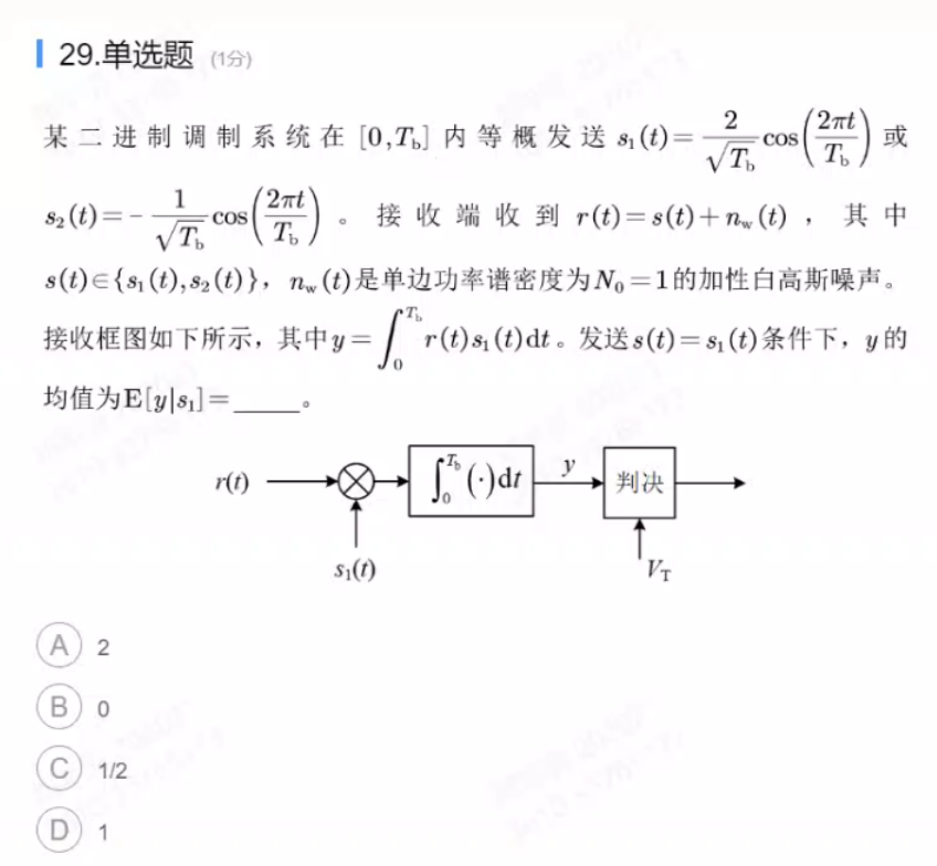 29. 某二进制调制系统在 [0,T] 内等概发送。接收端收到 r()-()+n),其中n(t)是单边功率谱密度为N1的加性白高斯噪声。接收框图如下所示,其中,发送s()=s;(t)条件下,y的均值为E[yls;]=