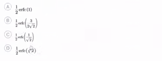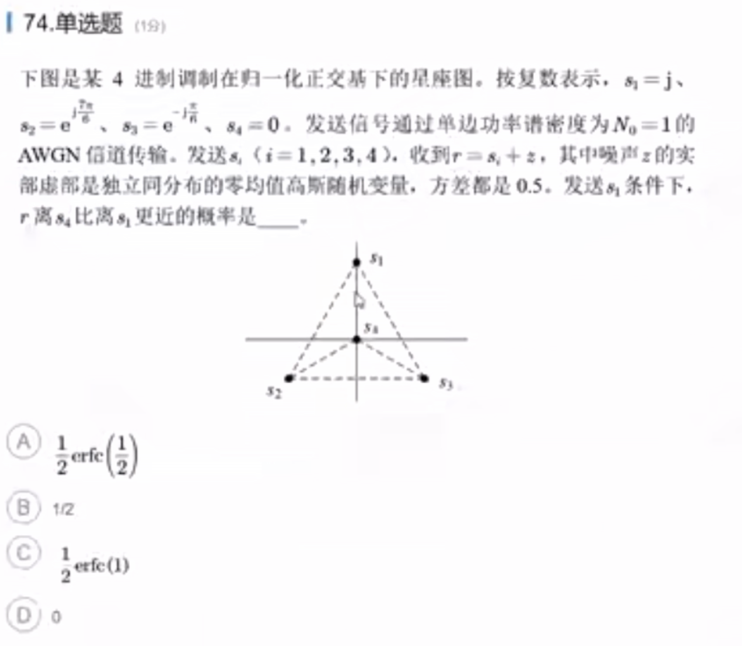 74. 下图是某 4 进制调制在归一化正交基下的座图。按复数表示,。发送信号通过单边功率谱密度为N-1的AWGN 信道传输。发送s(i=1,2,3,4,收到r,其中噪声z的实部虚部是独立同分布的零均值高斯随机变量,方差都是 0.5。发送s条件下,r离8a比离s,更近的概率是