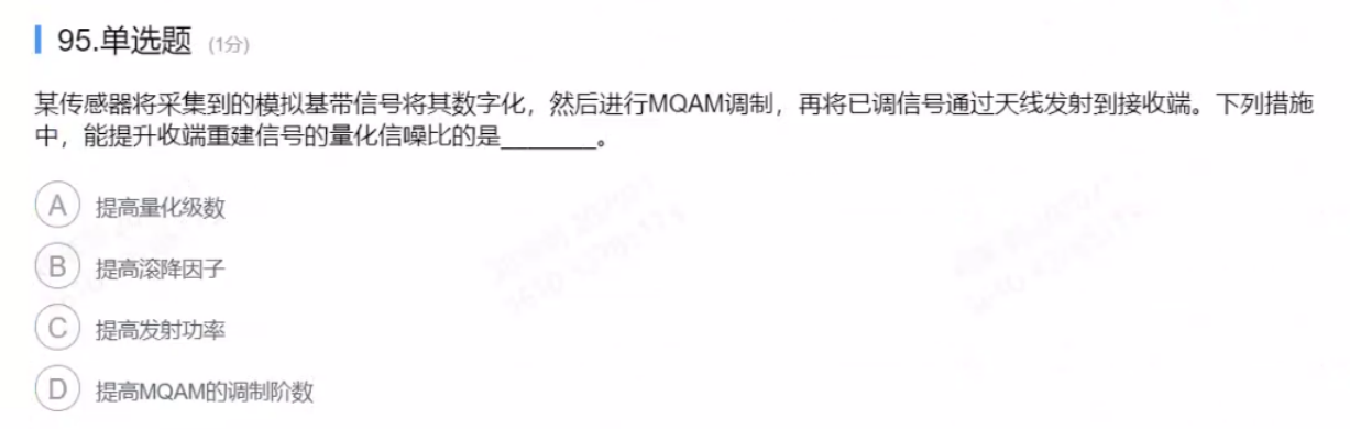 95. 某传感器将采集到的模拟基带信号将其数字化,然后进行MQAM调制,再将已调信号通过天线发射到接收端。下列措施中,能提升收端重建信号的量化信噪比的是