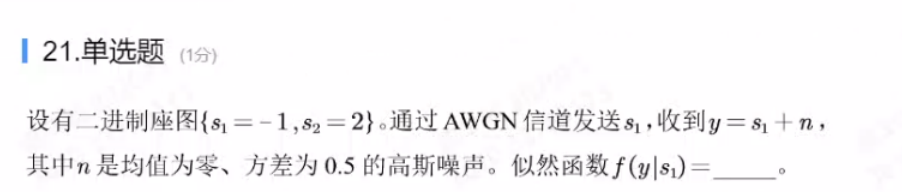 21. 设有二进制座图{s=-1,S2 = 2)。通过AWGN信道发送s,收到y= s +n,其中n是均值为零、方差为 0.5 的高斯噪声。似然函数f(si)-