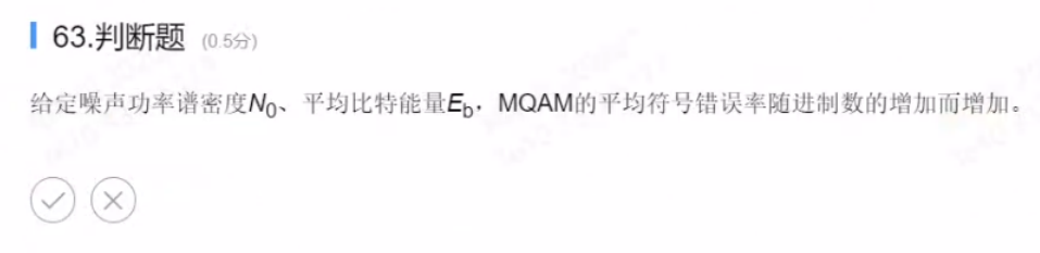 63. 给定噪声功率谱密度No、平均比特能量E, MQAM的平均符号错误率随进制数的增加而增加。