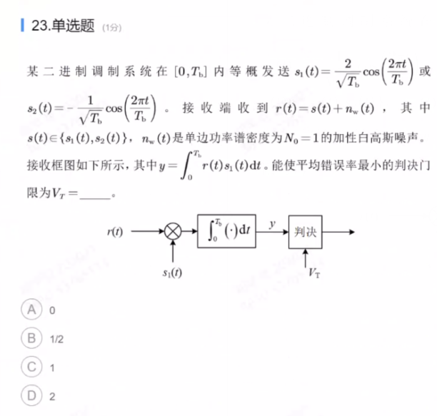 23. 某二进制调制系统在……内等概发送 或 。接收端收到,其中 是单边功率密度为 的加性白高斯噪声接收框图如下所示,其中y= 。能使平均错误率最小的判决门限为