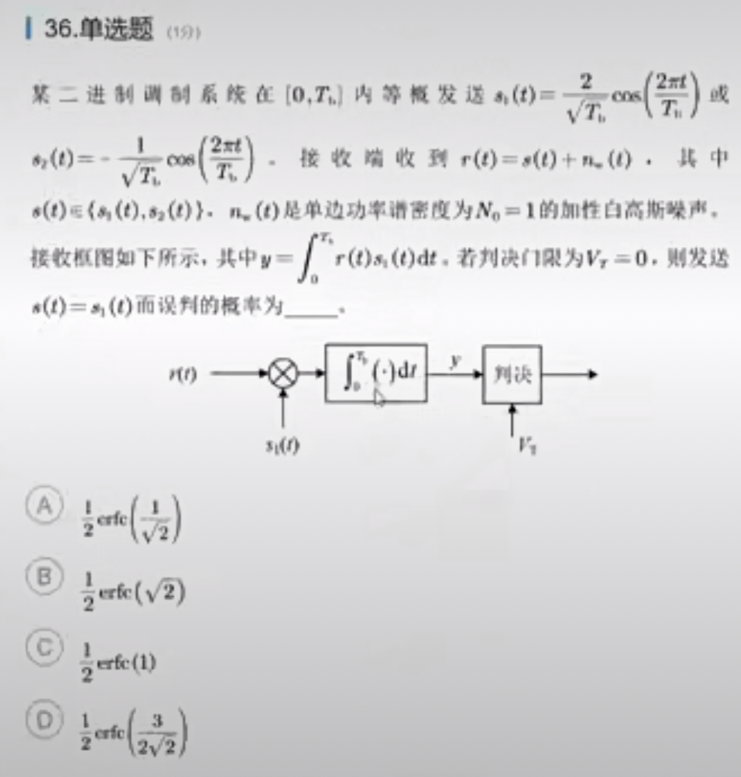 36. 某二进制调制系统在[0,T)内等概发送s,·接收端收到 r()=()+(,其中,n()是单边功率谱密度为N=1的加性白高斯噪声。接收框图如下所示,其中。若判决门限为V=0,则发送s()=为()而误判的概率为